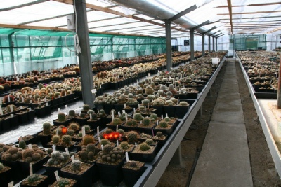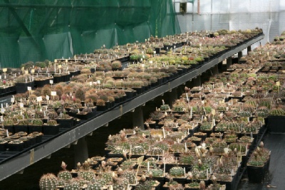 Je suis accueilli par Ingo Breuer en personne. Il m’explique qu’il y a eu beaucoup de changements dans les serres. Les collections de sulcorebutias et gymnocalyciums ont été déplacées dans une autre serre. Celle où nous nous trouvons contient toujours les collections de haworthias et autres plantes grasses. Plus d’espace est réservé aux plantes à vendre et pour la propagation.